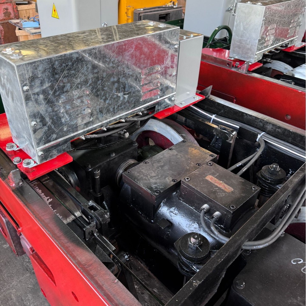 车架装置:车架为30mm钢板焊接结构,强度高、刚度大;不易变形。前后端板上装有弹性缓冲器,用以减轻冲击和连挂矿车。车架前部安装司机室顶棚装置,后端安装受电器支架,其间复盖薄钢板制的盖板,车架侧板下部开有缺口,缺口两侧装有导板,容纳弹簧和轴承箱于其中,以传递重量和牵引力,整个车架通过弹簧装置支承在走行装置的轴承箱上。