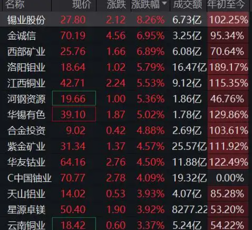 有色金属板块开盘表现活跃,锡业股份涨超8%,金诚信、西部矿业涨超6%,洛阳钼业、江西铜业、河钢资源、华锡有色涨超5%。